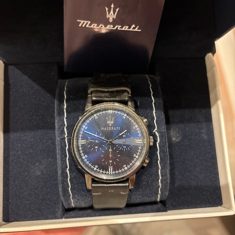 Maserati herreur med rød urskive og sort rem. Uret leveres i original emballage.
