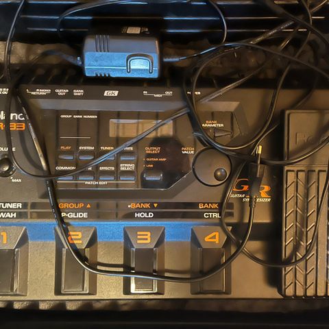 Roland GR-20 Guitar Synthesizer med dedikeret pick-up inkluderet. Indeholder avancerede lydfunktioner, MIDI-udgang og kompatibilitet med guitarer. Designet til at udvide guitarens lydmuligheder gennem synthesizer-teknologi.