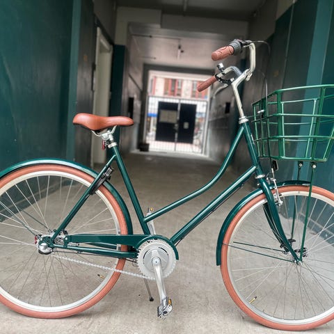 Cannondale Andre damecykel. Cyklen er designet til kvinder og har et stel i sort farve. Den er udstyret med bagagebærer og lygter, hvilket gør den velegnet til daglig transport.