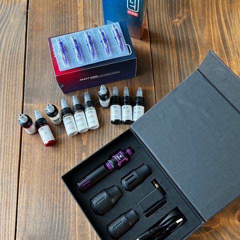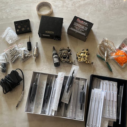 Diverse remedier til tatovering. Vigtigst naturligvis en Cheyenne Hawk Thunder. Der medfølger en masse nåle, fodpedal, blæk og strømforsyning. Eneste minus er at strømforsyningen driller mig lidt, men måske det bare er mig der ikke kender til hvordan den skal tunes. Jeg købte sættet til min hustru der legede lidt med ideen om at tatovere, men det blev aldrig til noget.