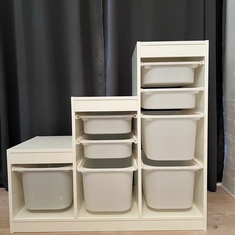 IKEA opbevaringsreol med tre orange plastikbokse. Reolen er designet til opbevaring og organisering af forskellige genstande og passer til børneværelser eller andre rum, hvor ekstra opbevaringsplads er nødvendig.