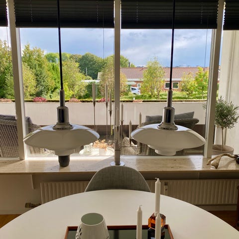 2 flotte pendler med skærme i hvidt opal glas. Lamperne er monteret med sort stofledning og fremtræder fejlfri. Sælges samlet for 4500,-