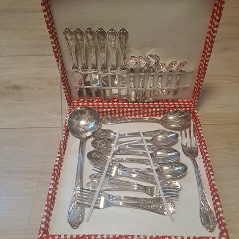 Bestik sæt bestående af skeer, gafler og knive i sølv og messing. Sættet indeholder forskellige størrelser og typer af bestik til brug ved måltider.