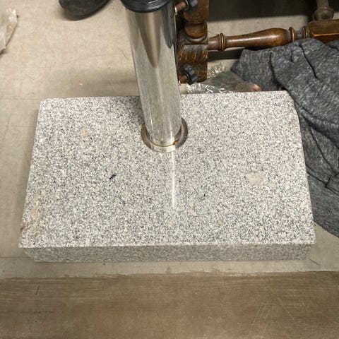 Granit parasolfod med kvadratisk form og metalstang til fastgørelse af parasol. Designet til at give stabilitet og støtte til parasoller i udendørsområder.