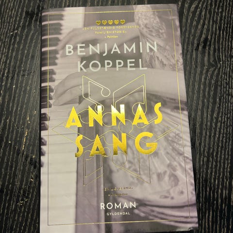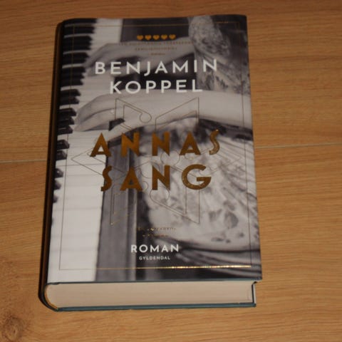Benjamin Koppel Annas Sang Roman. Bog med sort, hvid og gul omslag med musikalsk tema. Romanen er skrevet af Benjamin Koppel.