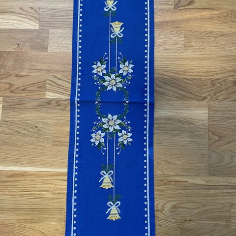 Fin juleløber i fin tynd stof. Jule løberen er broderet i hånden med fint julemønster og med fin påsyet blonde kant.