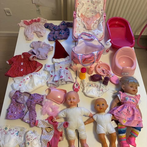 4 dukker med forskelligt tøj og tilbehør, herunder sutter, flasker, bestik, pusletaske og bleer. Sættet indeholder også den klassiske røde dukkevogn.