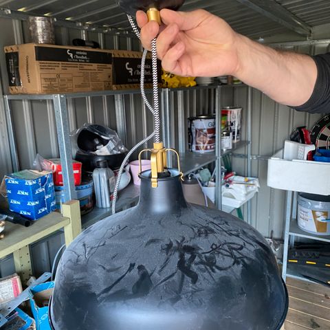 Fin loftlanpe med stofledning ca 1m lang. Den er nem at holde ren, og giver et hyggeligt lys, som kan dæmpes ved træk i snoren.