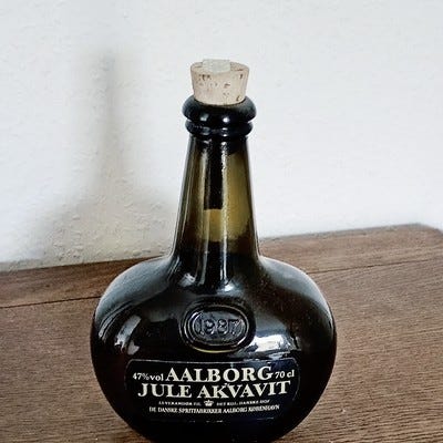 D.R. Andersen snaps og Martell VS Cognac i flaske med mørk ravfarve. Begge flasker indeholder spiritus til konsum.