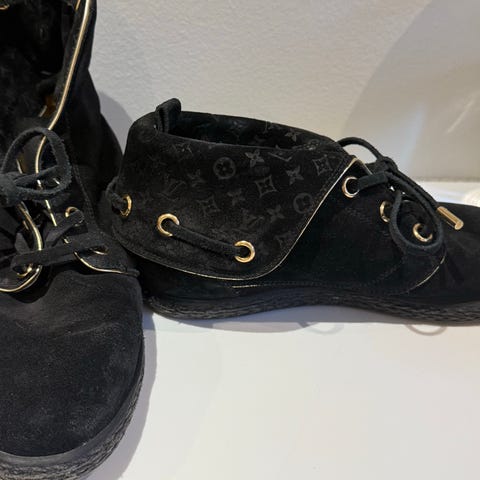 Eksklusive Louis Vuitton ankelstøvler i sort lĂŚder med snørelukning og ikonisk LV-logo i guldmetal pĂĽ ankelremmen. Klassisk og tidløst design med kraftig sĂĽl â bĂĽde elegant og robust. Størrelse 36