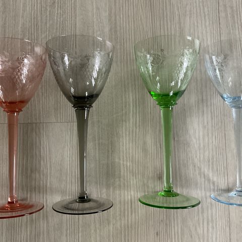 Sæt bestående af farvede vinglas. Glasene har stilk og er i forskellige farver, herunder grøn, rød, blå, gul og sort
