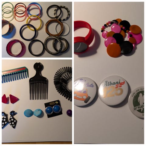 Lot med retro og vintage smykker, nogen har patina og andre er i super stand. Intet ægte guld/sølv, materialerne er metal, plastik, ben og glas.