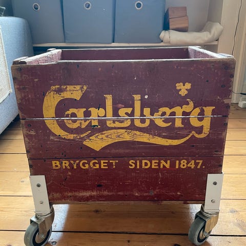Carlsberg trækasse i brunt med gult logo og teksten 'Brygget siden 1847'. Kassen er åben i toppen og har en rektangulær form. Materialet er træ, og den har en robust konstruktion.