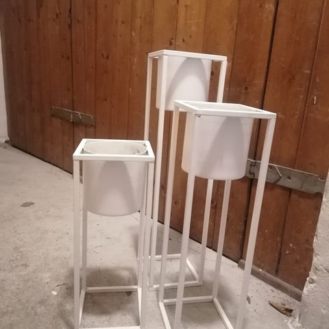 Metal. Bakken måler ca 27x27 cm og krukkerne er ca 11 cm høje og har en diameter på ca 8,5 cm. Kan bruges til planter - har selv brugt på skrivebord til penslet, farver, blyanter, sakse mm. På billederne er der kun 8 krukker, men jeg fandt den sidste, så nu er der 9 :)
