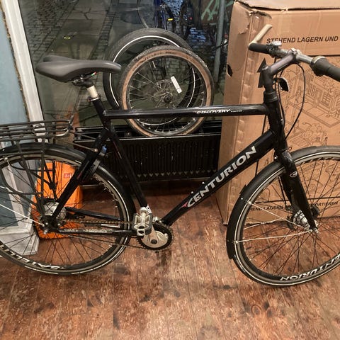 Centurion Herre Bycykel. Cyklen er designet til mænd og har et stel og hjul, der er velegnet til bykørsel. Den er udstyret med skærme og en komfortabel sadel. Farven er en kombination af grå og blå.