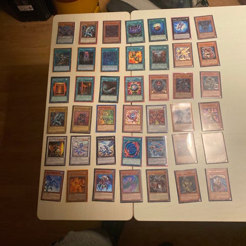 Samling af Yu-Gi-Oh kortspil med forskellige monster-, trylle- og fælde-kort. Kortene er lagt ud på et bord og indeholder en række forskellige karakterer og korttyper fra spillet De Sælges samlet og jeg sender gerne de kan afhentes i Højby Tårnby eller i Hvidovre og jeg kan evt leverer i Kbh og omg for 50-100kr mvh Michael