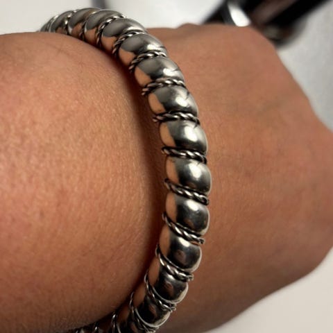 Armbånd i nysølv med en spænde-lukning. Design Hans Jensen Leveres i en opbevaringsæske med rød inderside. Str. D: 5-6 cm B: 2 cm Forsendelse Kr. 43.-