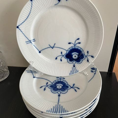 4 Royal Copenhagen Blå Mega (blue fluted mega) frokosttallerkner med en diameter på 22 cm. Tallerkenen har et klassisk blåt blomstermønster på hvid porcelæn.