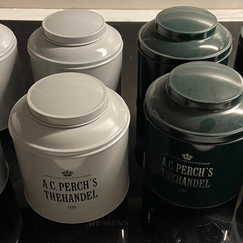 Savarin Coffee dåse i metal med tryk på toppen "Key on Bottom". Dåsen er rund og har en rød og hvid farve med logo og tekst på ydersiden. Fra Schönbrunn i New York