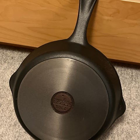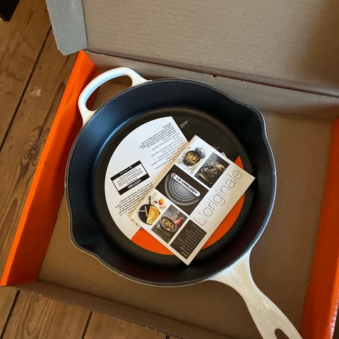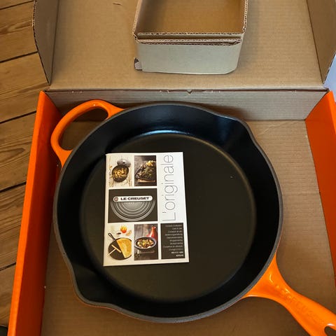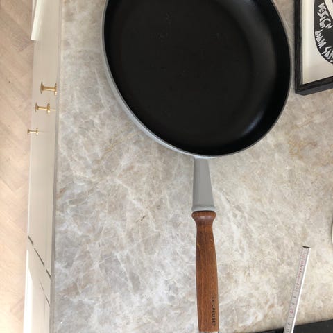 Le Creuset stegepande i støbejern med en diameter på 26 cm. Farven er blå, og panden er designet til at fordele varmen jævnt, hvilket gør den egnet til forskellige madlavningsformål.