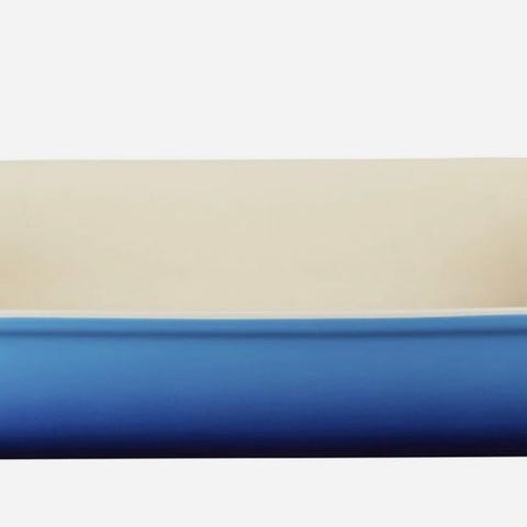 Le Creuset ovnfast fad på 26 cm med en kombination af blå yderside og cremefarvet inderside. Fadet er designet til brug i ovnen og kan anvendes til bagning og stegning af forskellige retter.