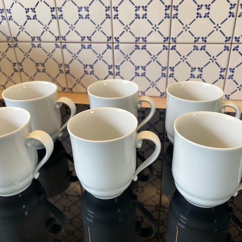 Royal Copenhagen kopper i hvid porcelæn. Sættet indeholder flere kopper med hank, velegnet til servering af varme drikke. Klassisk design uden dekorative mønstre. Der er 11 stk som fejler ikke noget. en som har fået en lille rift som kam ses på billedet