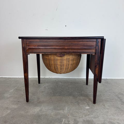 Ejvind a Johansson sybord i fineret og massivt teak med underliggende skuffe og fletkurv .