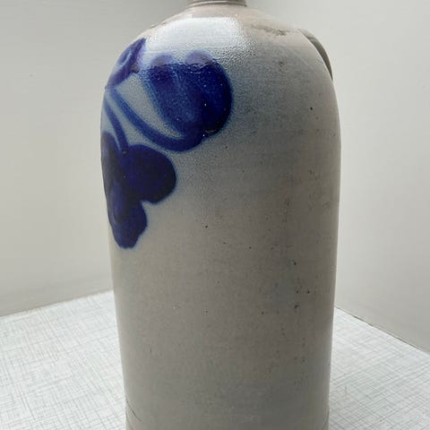 Dette er en mundblæst glaskande eller vase med et farverigt, plettet design.
