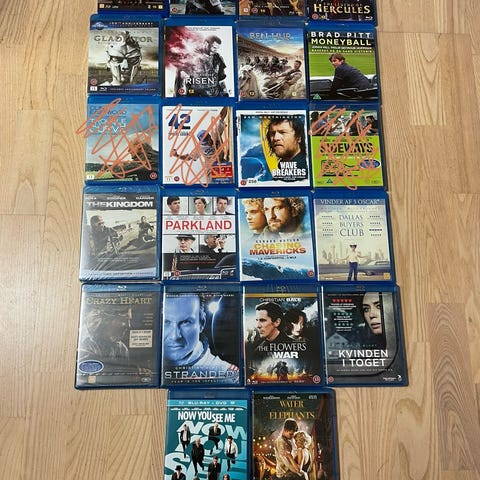 Samling af 54 forskellige blu-ray-film med forskellige titler og genrer.
