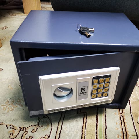 Transportabel værdiboks til opbevaring af penge, pas og øvrige papirer med to nøgler. Safety kommer med et praktisk monteringsbeslag, der gør det nemt, at tage boksen med sig. Anvendelig i campingvogne, autocamper, både, kontoret eller i f.eks. i hjemmet. Mål: boks: B 15 x D 21 x H 5,5 cm. Næsten ny, brugt kun en gang. Fra ryge-og dyrefrit hjem. Gode P forhold ved afhentning på adressen. Sender ikke. KUN KONTANT VED AFHENTNING.