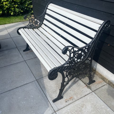 Vintage havebænk i metal med hvid maling og synlige rustpletter. Bænken har et gittermønster på sæde og ryg, samt dekorative detaljer i ryggen. Velegnet til udendørs brug i haven eller på terrassen. Bemærk at bænken har slid og rust på flere steder.