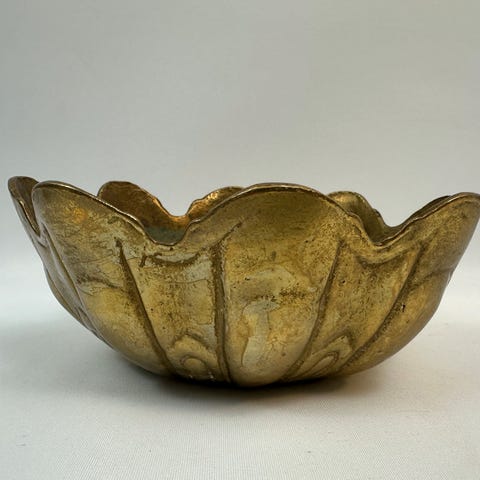 Håndgraveret vintage messingfad fra Indien med smukke florale detaljer og tre små pigge på undersiden – perfekt til smykker, røgelsespinde eller som lille boho dekoration.
