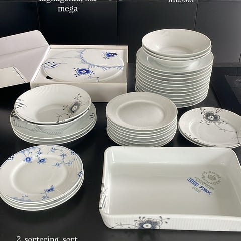 Royal Copenhagen serveringsfad (24 cm) og skål (47 cl/15,5 cm) med sort bladmønster (sort mega mussel). Sælges også individuelt. Sendes ikke!