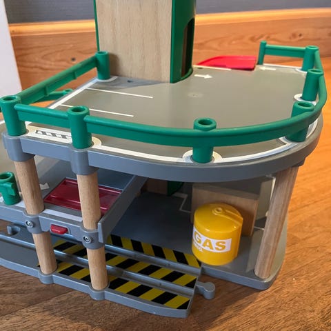 BRIO Parkeringsgarage med flere niveauer, rød rampe, grønne gelændere og træmateriale. Brugt men i rigtig fin stand. Masser af leg for nye legeglade børn :)
