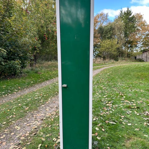 Rød metall garderobeskap med flere rom, egnet for oppbevaring af tøj og personlige eiendeler.