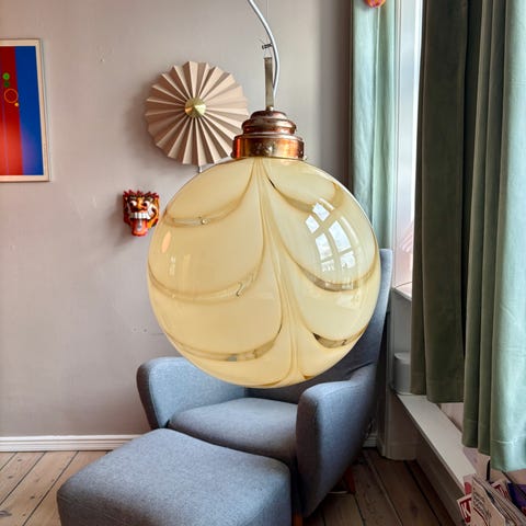 Lampen er enorm smuk i sit swirl. Glasset er mundblæst i en betagende oval form med swirl mønster. Da lampen er håndlavet kan der være små unikke kendetegn og uregelmæssigheder ved glasset.