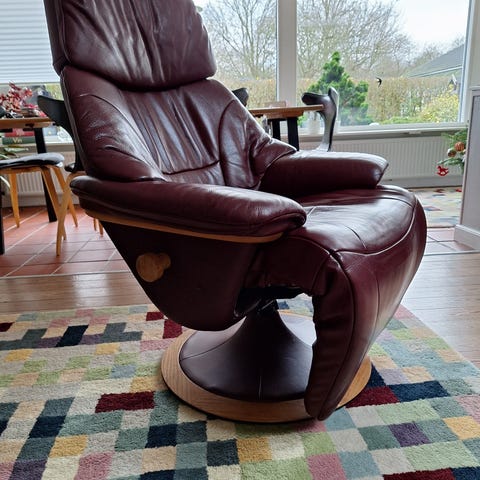 Elegant og superkomfortabel lænestol i læder med drejefod, med recline vippefunktion og nakkestøtte fra BD Møbler med medfølgende fodskammel. Stolen er ca. 5 år gammel, men står i fremragende stand uden synlige brugsspor - ser næsten ud som ny. Perfekt til stuen, læsehjørnet eller kontoret, hvis du vil forkæle dig selv med luksus og komfort.