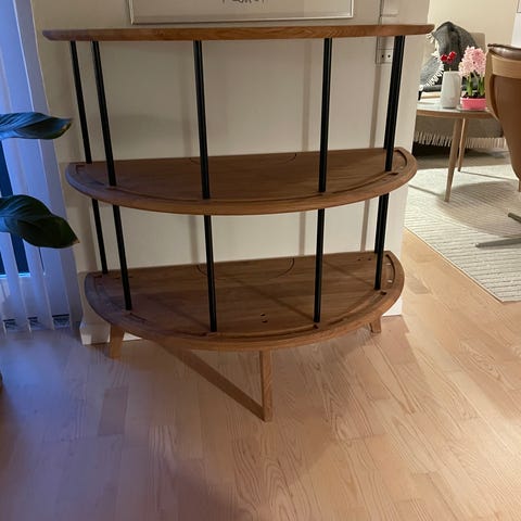 Mellempladen er udført i massiv egetræ og rørene er sortlakeret stål.