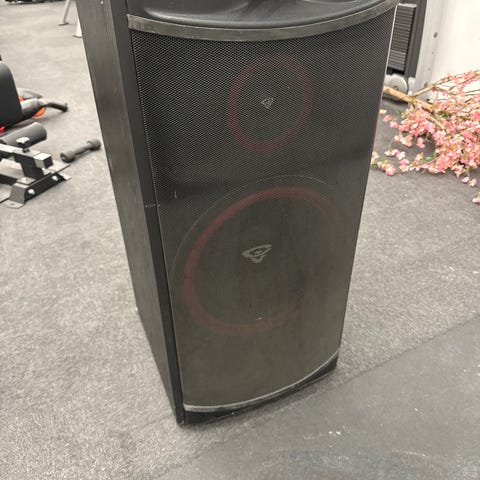 Cerwin-Vega Cerwin-Vega DC 12 speaker med frontmonteret stor woofer med rød kant og en mindre diskant ovenover. Sort kabinet med tilslutninger på bagsiden. Designet til lydafspilning i hjem eller studie.Nye ophæng