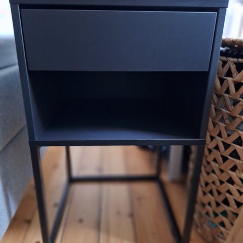 Sengebord fra Ikea (Vikhammer, nypris 599 kr.) & lampe (husker ikke). Bordlampe 44 cm høj, bordfod diameter 16 cm. Lille pærefatning. Sort stofledning. Begge med få brugsspor, brugt kort tid på gæsteværelse.