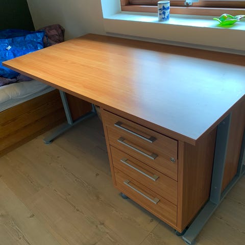 Skrivebordet skal hentes og bæres ned af trappeopgangen, dog er det et forholdsvis let skrivebord og jeg skal nok hjælpe med at bære den.