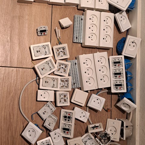 Sættet indeholder forskellige elartikler som stikkontakter, rammer og afbrydere i flere farver og materialer. Produkterne inkluderer både en- og dobbeltstikkontakter samt forskellige typer monteringsrammer. Egnet til elektriske installationer i hjem eller erhverv.
