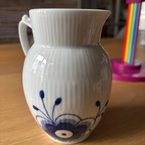 Royal Copenhagen Blå Mega mælkekande med en kapacitet på 38 cl. Kanden er fremstillet i porcelæn og har det karakteristiske blå blomstermønster. Velegnet til servering af mælk eller fløde.