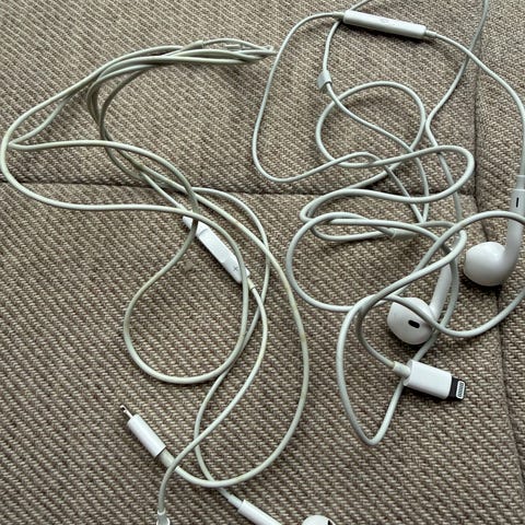 Apple headset med opladningsetui. Produktet er hvidt og trådløst.