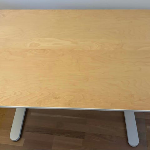 Sælger et ikea Bekant skrivebord med træbordplade og hvide justerbare ben. I god stand, dog med få skræmmer.