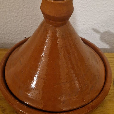 Tagine eller Tajine, kan skrives på begge måder, betyder lerfad på berbisk og fungerer lidt på samme måde som en stegeso, utrolig effektiv til simreretter og samtidig meget dekorativ.