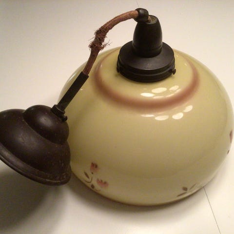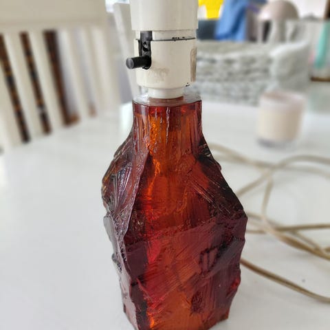 Retro hængelampe fremstillet i ravfarvet glas med sort metalramme. Lampen har en unik, buet form og er designet til ophængning i loftet. Velegnet til brug i stuer, spisestuer eller andre indendørs rum, hvor en dekorativ belysningsløsning ønskes.