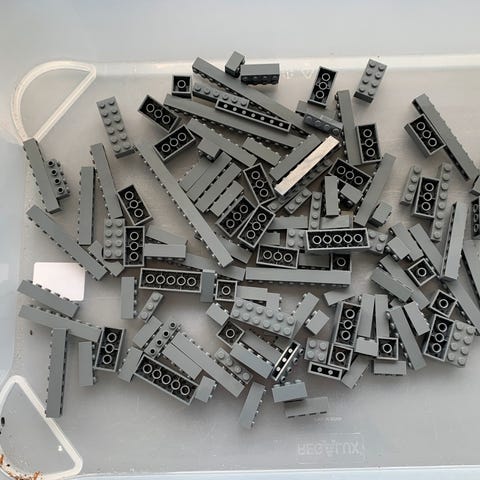 LEGO byggeklodser i forskellige størrelser og former, assorterede dele i grå, grøn og hvide farver. Materiale er plast. Egnet til børn til konstruktion og kreativ leg.