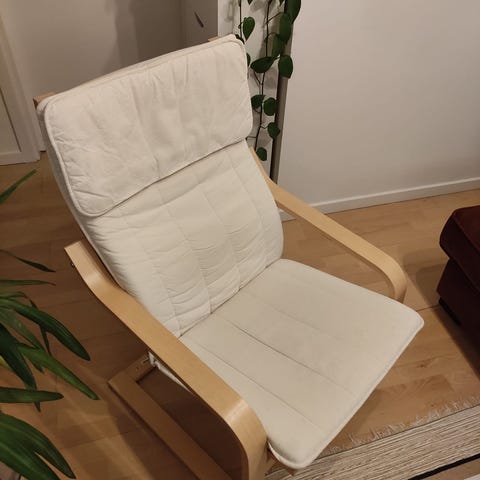 Lænestol, stof, Ikea, Pæn velholdt lænestol i hvidt stof og egetræ. Ingen pletter og fra røgfrit hjem. Ca 68 cm bred og 80cm dyb.