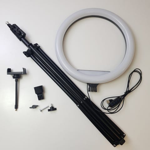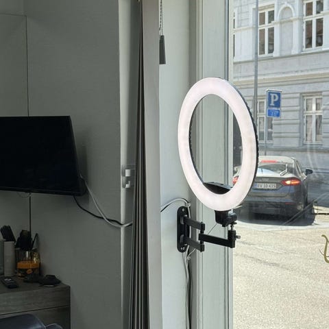 Professionel ring light til makeup, foto og videoSkab jævnt, flatterende lys til alt fra makeup til optagelser og livestreams. Denne LED ringlampe 60 W leveres med telefonholder, kuglehoved og et justerbart trefods-stativ, så du hurtigt kan sætte en stabil opsætning op - derhjemme, i studiet eller i skønhedssalonen.Fleksibel belysning med tre farvetonerVælg mellem varm (3.000 K), neutral (4.000 K) eller kold (5.800 K) farvetemperatur og finjustér lysstyrken via fjernbetjeningen på kablet. Den runde form giver et ensartet lys på ansigt og motiver, ideelt til selfies, tutorials og produktfotos.Nem strøm og mobil monteringLampen får strøm via USB, så du kan bruge powerbank, laptop eller en USB‑adapter. Telefonholderen har en fleksibel, roterbar arm, der gør det nemt at finde den rette vinkel. Når du er færdig, kan stativet foldes sammen, så det fylder minimalt.Tre farvetemperaturer og trinløs lysstyrke for perfekt belysningUSB-strøm – brug med powerbank, laptop eller adapterFleksibel telefonholder og roterbart hoved for præcis vinkelStabilt, højdejusterbart stativ op til 220 cmIdeel til makeup, selfies, optagelser og fotosEffekt: 60 WStrømforsyning: USB-kabelLystilstande: Varm 3.000 K; Neutral 4.000 K; Kold 5.800 KLysstyrke: Justerbar via fjernbetjening på kabletMaks. stativhøjde: 220 cmLampe-diameter: 26 cmIndhold: Ringlampe, fleksibel telefonholder, kuglehoved, justerbart stativ